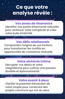 Les réponses sont dans vos cieux respectifs. Bien plus qu'une simple compatibilité de signes (oubliez les clichés "Bélier vs Cancer"), je compare l'intégralité de vos deux thèmes astraux – c'est la synastrie – pour révéler la dynamique unique de votre couple.