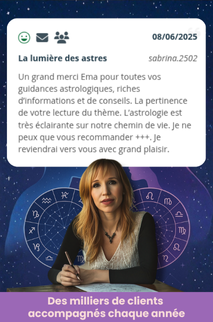 Ema étudie personnellement vos cartes du ciel et vous envoie votre document complet (PDF) par email sous 72 heures.